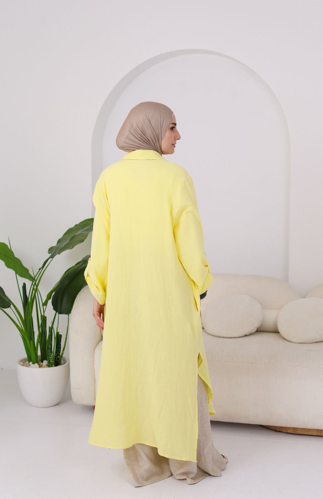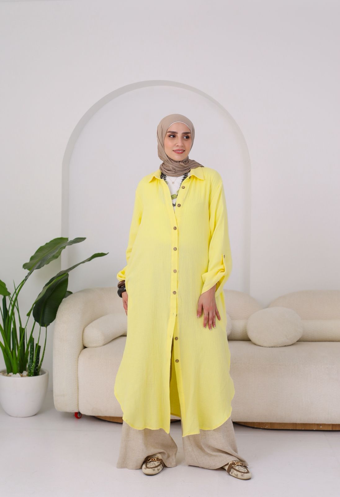 Can be styled open over pants or buttoned up for a chic, modest look.